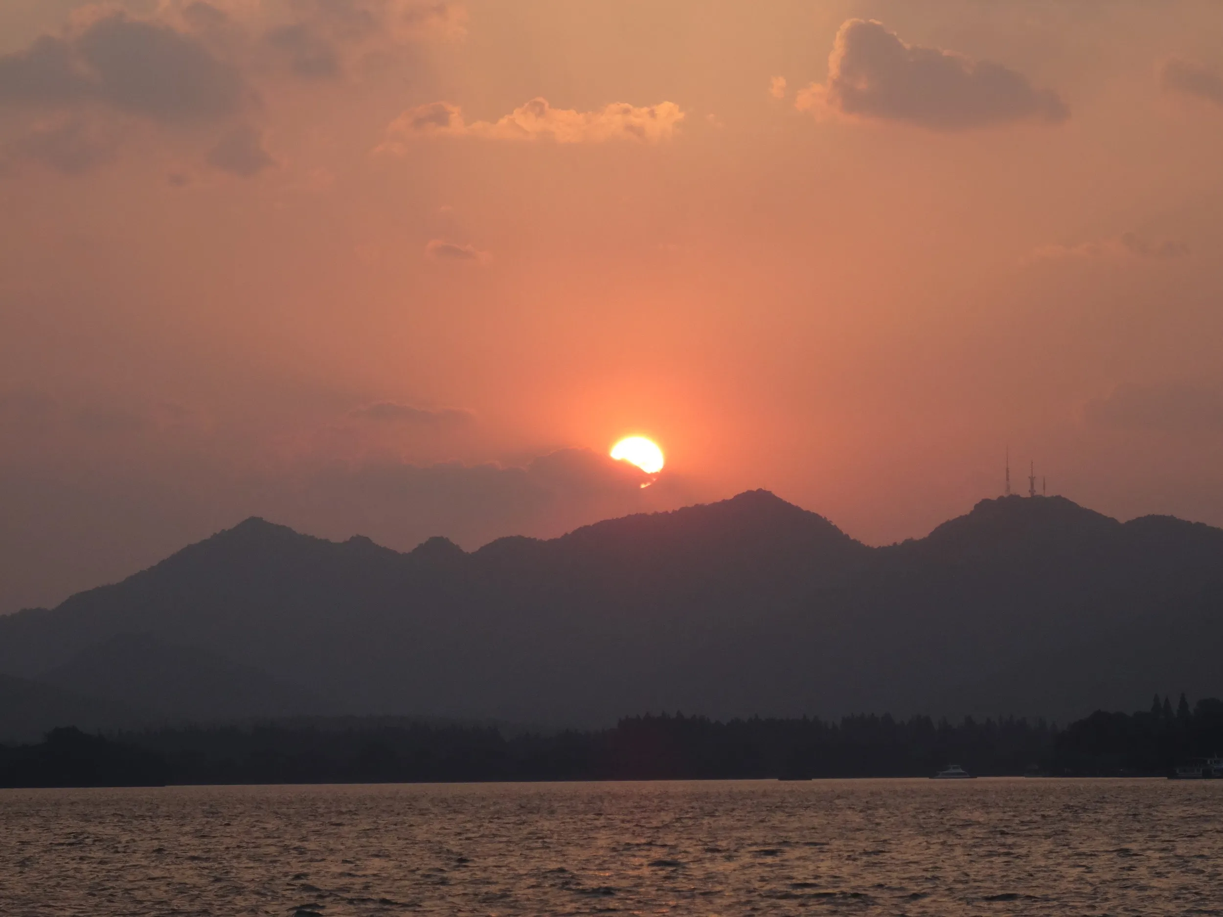 ダイナミックで神々しい西湖の夕陽。因みに西湖で夕陽を見るのは初めてだったから、感動も一際大きかった。
